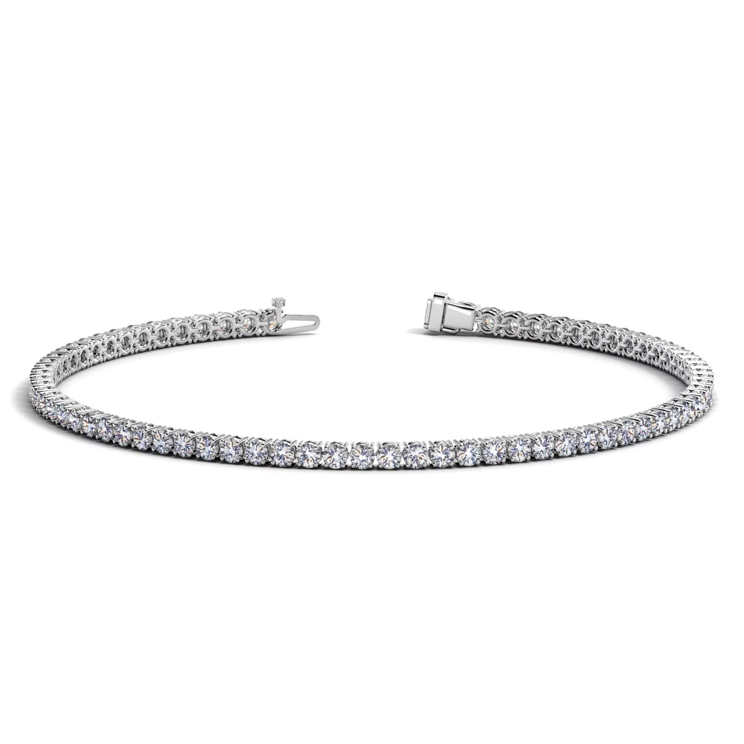 Classic four prong 2 carat total weight diamond tennis bracelet showcasing perfectly matched brilliant round cut lab grown diamonds set in 14k white gold.